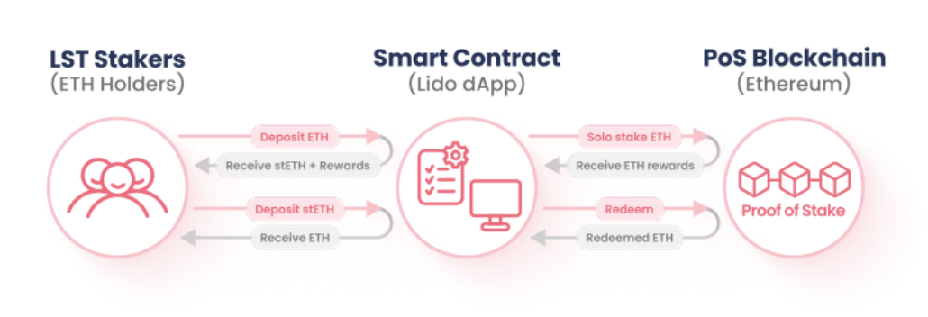 Khi có 1 user stake vào mạng Liquid staking protocol (LSP), LSP sẽ issue cho user đó 1 lượng token đại diện với lượng ether mà user đó gửi vào. Về rate trao đổi giữa ether user gửi vào và lượng token đại điện được issue ra sẽ tuỳ thuộc vào từng thời điểm, rate chênh lệch giữa Ether và token đại diện sẽ là lượng reward mà user nhận được
