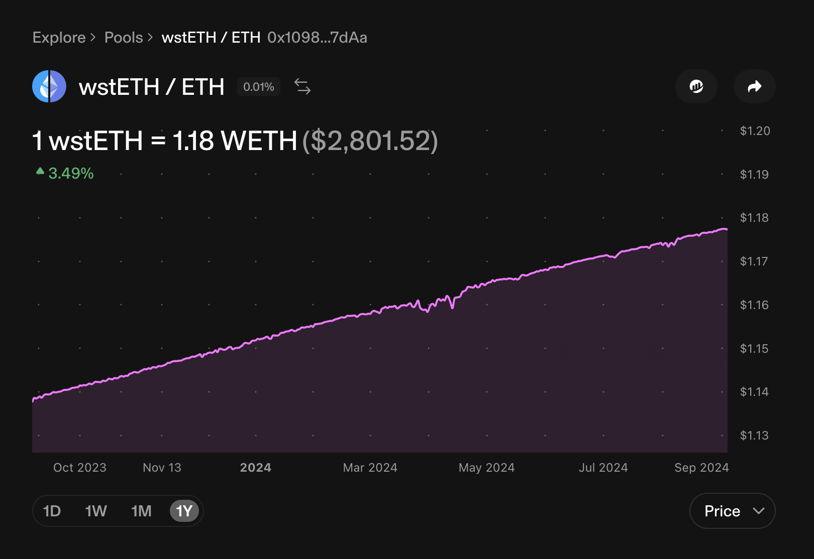 Như hình dưới đây là exchange rate của ETH với wstETH - token đại diện được Lido (dự án lớn nhất về Liquid staking trên Ethereum) issue ra, có thể thấy được rate này sẽ luôn luôn tăng do lượng yield được sinh ra trong hoạt động staking: